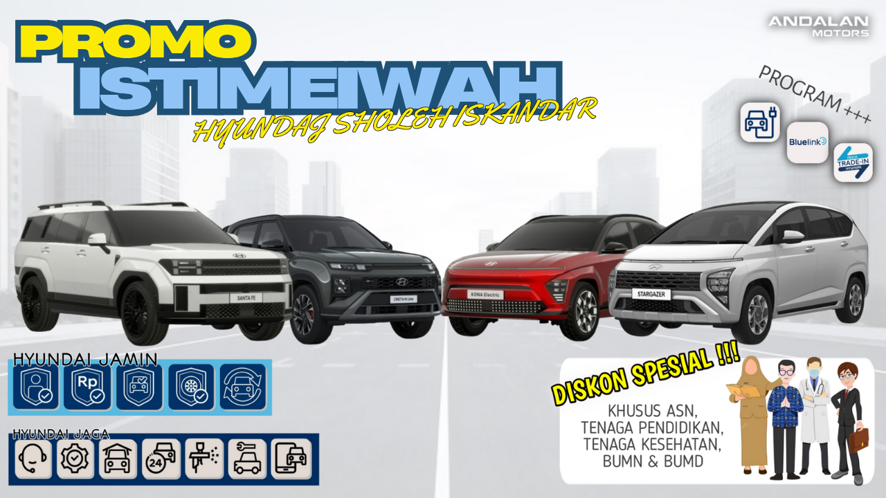 Melayani Pembelian Cash, Credit & Tradein. Siap mewujudkan mobil impian anda dibantu dengan Sales Consultant terpercaya. Menawarkan berbagai varian mobil Hyundai baik kategori LMPV, LSUV, Crossover , Big Van dan Premium SUV. Hanya di Hyundai Bogor - Sholeh Iskandar bisa mendapat Promo Akhir Tahun & Pelayanan Terbaik. Tersedia unit : Hyundai Ioniq 5, Hyundai Stargazer, Hyundai Creta, Hyundai Staria, Hyundai Palisade, Hyundai Santa Fe, Hyundai Kona. Melayani Area Wilayah Jabodetabek dengan adanya Hyundai Bogor, Hyundai Depok, Hyundai Tangerang, Hyundai Jakarta, Hyundai Bekasi, Hyundai Sukabumi, Hyundai Bandung & Sekitarnya. Kenapa Harus Pembelian di Dealer Hyundai Bogor - Hyundai Sholeh Iskandar :